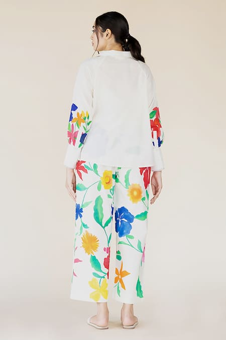 Off white top featuring floral hand painted motifs on the sleeves