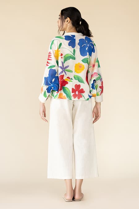 Off white cape featuring vibrant flower hand painted motifs and front buttons