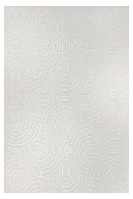 White rectangular shaped fine handcrafted rug with scalloped carved patterns in cut pile finish.