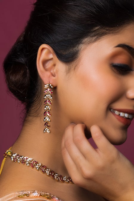 Buy_Queens Jewels_Red Pearls, Stones Studded Foliage Necklace Set _at_Aza_Fashions