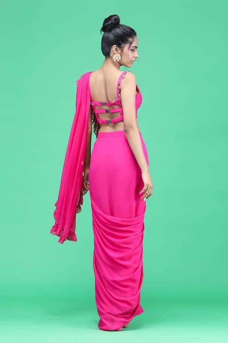 Hot pink saree with attached petticoat sequin and crystals embroidery. Comes with back buckled up padded blouse.