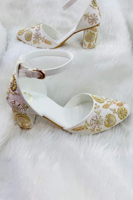 White mule block heels featuring floral embroidery in zari, sequin, and nakshi work