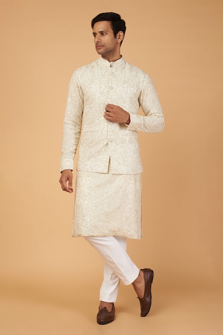Ivory bundi featuring floral and sequin embroidery with a band neckline and full sleeves. Paired with an embroidered kurta and pant.