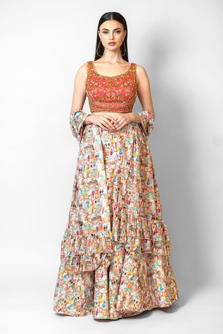 Ivory lehenga featuring all over Rajputana print with ruffle trim. Paired with a sleeveless blouse adorned with floral cutdana and sequin embroidery, complemented by a dupatta.