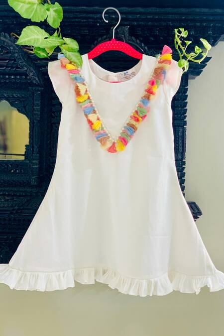 Buy_Rage Attire-Sweta Saria_Off White Cotton, Silk Tassels Frilled Hem Taselled Dress_at_Aza_Fashions