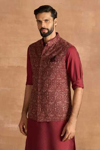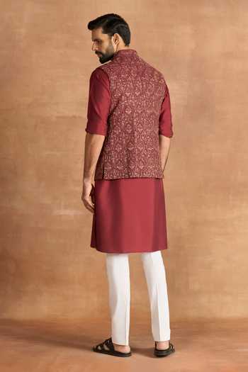 Maroon Nehru jacket in silk with antique gold embroidery and a structured silhouette. Designed to elevate festive and ceremonial ensembles, it combines traditional craftsmanship and refined elegance.