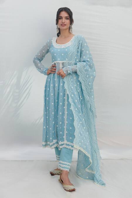 Buy_Mulmul_Blue 100% Pure Mulmul Embroidered Floral Raia Anarkali With Pant _Online_at_Aza_Fashions