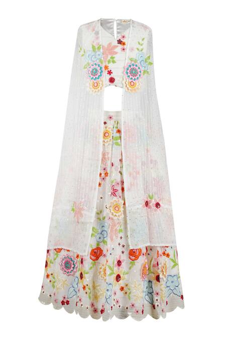 White Georgette, Satin Embroidery Floral Lehenga Set