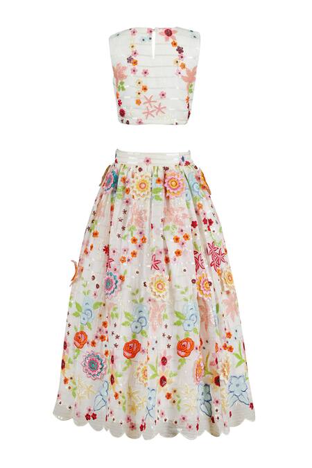 White lehenga featuring 3D floral embroidery all over. Paired with an embroidered blouse and dupatta.