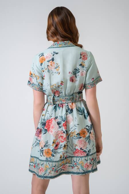 Multi color crinkle mini dress featuring a collared neckline and belt