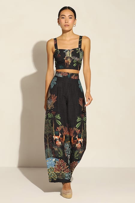 Multicolored corset top with signature Amazon forest print in linen blend base.