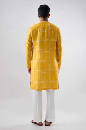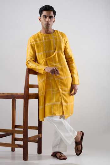 Yellow kurta crafted from Silk Tencel, featuring a subtle geometric bandhani pattern. The kurta has long sleeves and an overlapped front placket.