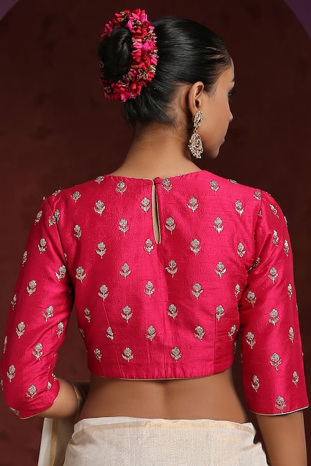 Pink blouse made from raw silk featuring zardozi hand embroidered floral buttis