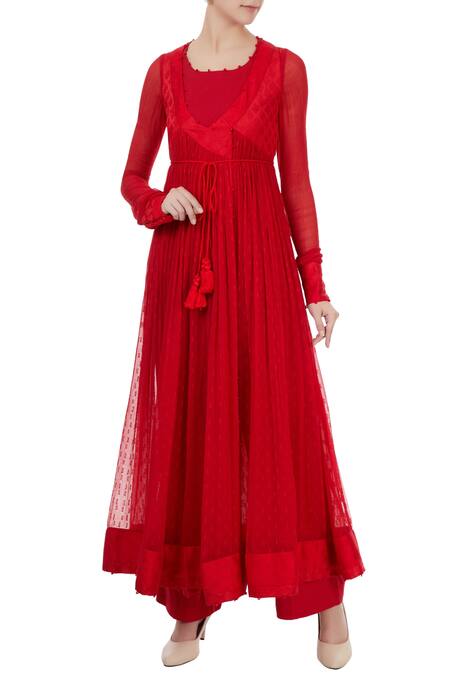 Red angrakha jacket created in lightweight and sheer chiffon fabric. It is teamed up with a minimal sleeveless blouse and a pair of red sleek pants.