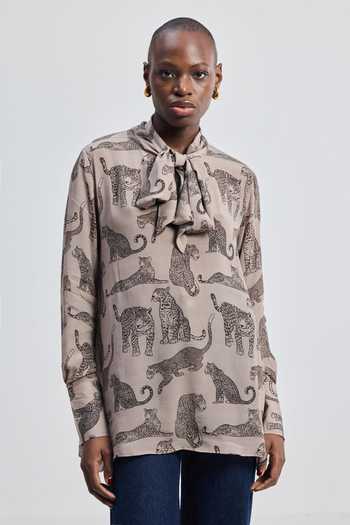 Grey Bemberg shirt with animal-print pattern and front-tie detail.