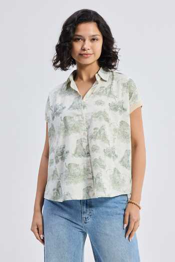 Grey Cotton V-neck, Collared Animal Print Shirt