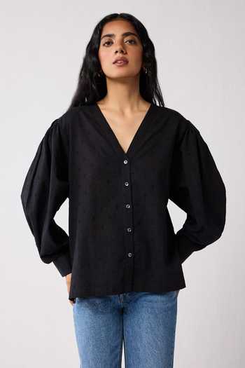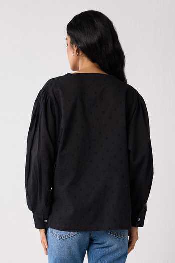 Black organic cotton shirt with embroidered eyelet texture and puffed dolman sleeves.