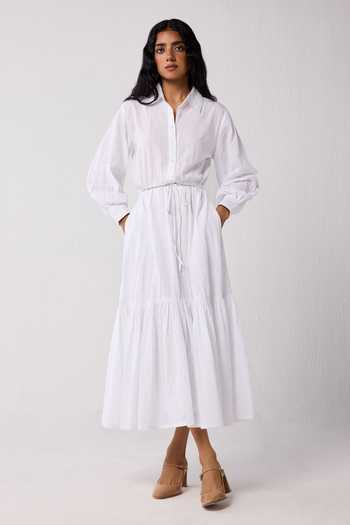 White Cotton Collared Embroidered Tiered Dress