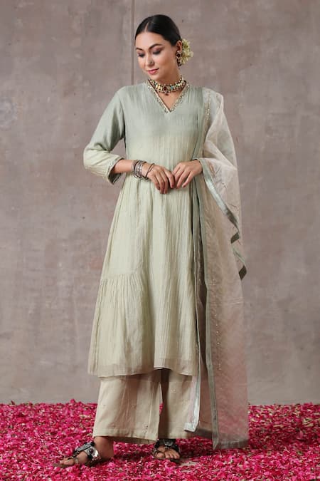 Green Organza, Chanderi, Cotton Silk Mukaish Work V Neck Embroidered Kurta Set