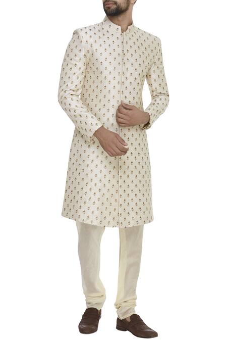 Off White Raw Silk Embroidered Resham Sherwani Set