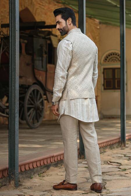 Beige, cream reversible bundi with moroccan pattern. Paired with kurta and pants.