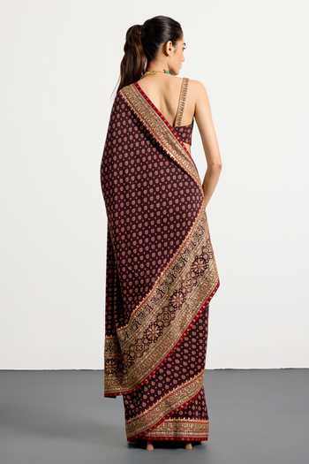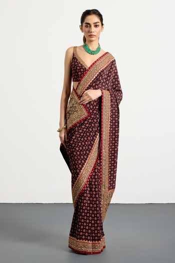 Brown & Multi saree with geofloral print and aari-hand embroidery. Paired with an unstitched blouse piece.