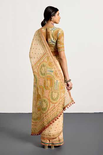 Beige saree with geo floral print and Gaj embroidery, paired with a fitted blouse.