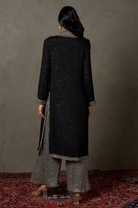 Black Shimmer Georgette Lurex Embroidery Sequin Mandarin Kurta Palazzo Set
