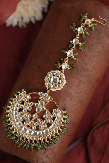 Green maangtikka featuring floral design, studded with real jadtar stones and semi-precious pearls. It includes green glass bead tassels and an adjustable hook closure.