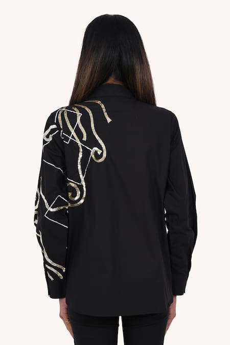Black shirt featuring sequin hand embroidery on one side with cuff sleeves