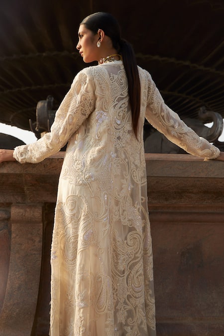 Ivory Organza Embroidery Pearl Ewaaz Pre-draped Saree Set With Jacket