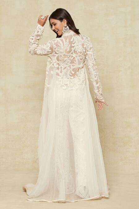 White longline ruffle collared jacket featuring pearl work embroidery. Paired with a scalloped and tassel hem blouse along with coordinating pants.