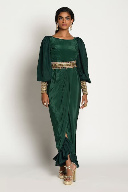 Bottle green draped gown with frill hem, embroidered puff sleeves. Paired with embroidered belt.