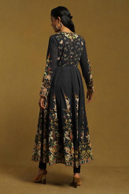 Black Anarkali featuring blooming floral print with full sleeves and round neckline. Paired with leggings and a dual shaded dupatta with floral print border and tassels.
