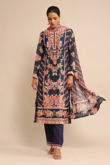Navy blue kurta featuring floral motif prints with a round neckline and three-quarter sleeves. Paired with matching pant and dupatta made from cotton chanderi and rayon slub fabrics.