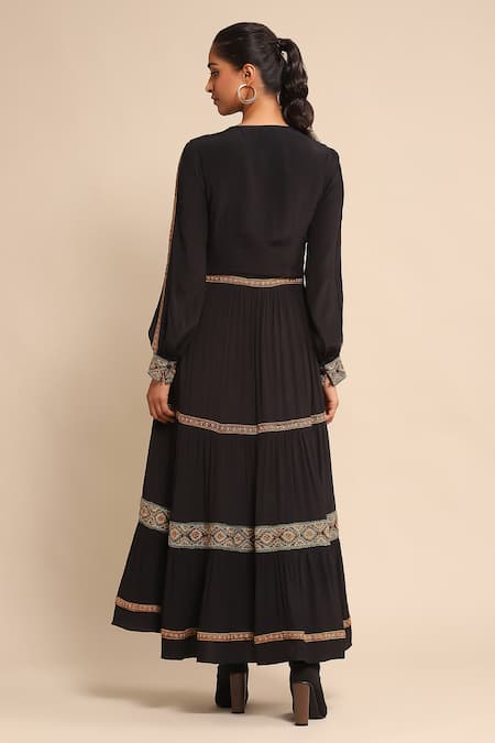 Black Viscose Embroidery V-neck Thread Tiered Dress
