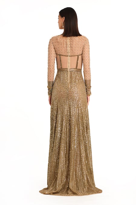 Antique gold net gown featuring a corset bodice with tonal sequin work and Swarovski stones