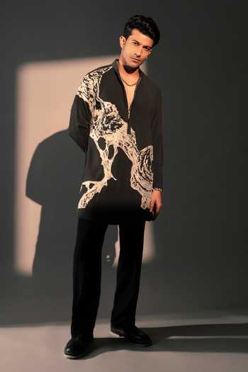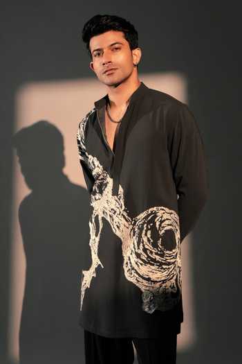 Black Matterhorn kurta with large embroidered spiral motif.