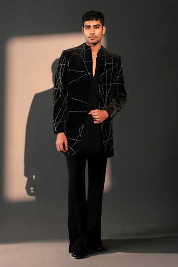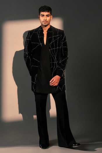 Black kurta set with broken embroidery detailing on the jacket, paired with a matching pant in imported polyester.
