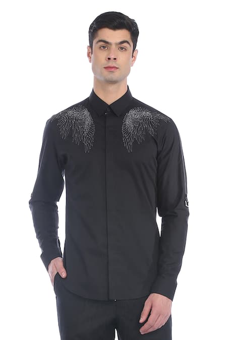 Black shirt featuring hand embellished wing motif embroidery with beaded crystals