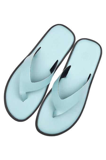 Powder blue cushioned slippers with V strap & split toe crafted in leather.