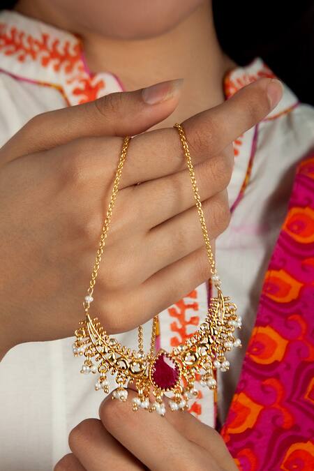 Cutwork details enhancing the design, Embellished with a central ruby stone, Delicate pearl accents throughout the necklace