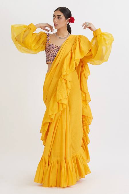 Buy_Peeli Dori_Yellow Cotton Satin Embroidery V Neck Ruffle Saree With Blouse_Online_at_Aza_Fashions