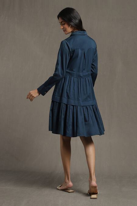Blue Cotton Satin Collared Ruffled Hem Shirt Dress