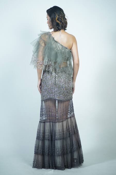 Grey one shoulder blouse featuring tassel embroidery and asymmetric sleeves. Paired with a matching skirt showcasing intricate embroidery details.