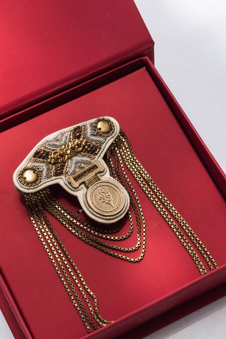 Off White Zari, Beads, Cut Work Metallic Embellished Crest Brooch