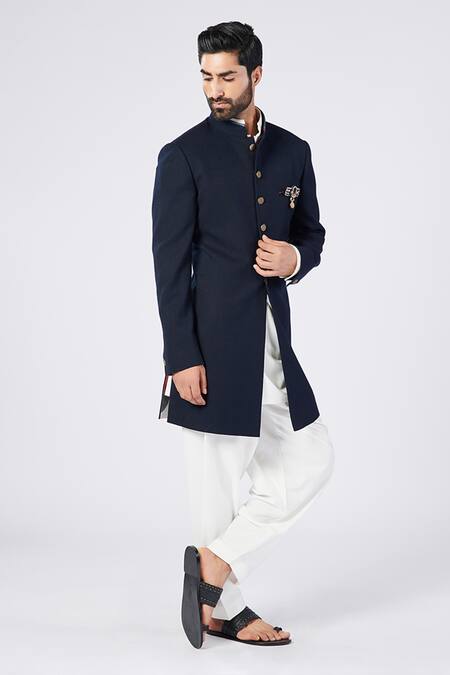 Navy sherwani featuring full sleeves and a Mandarin collar