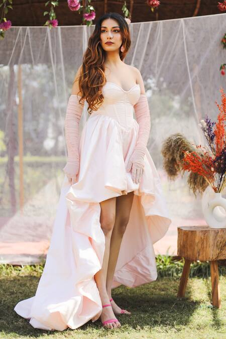 A baby pink high low jacquard gown featuring a sweetheart neckline, corset padded bodice, and a back criss-cross tie-up detailing.