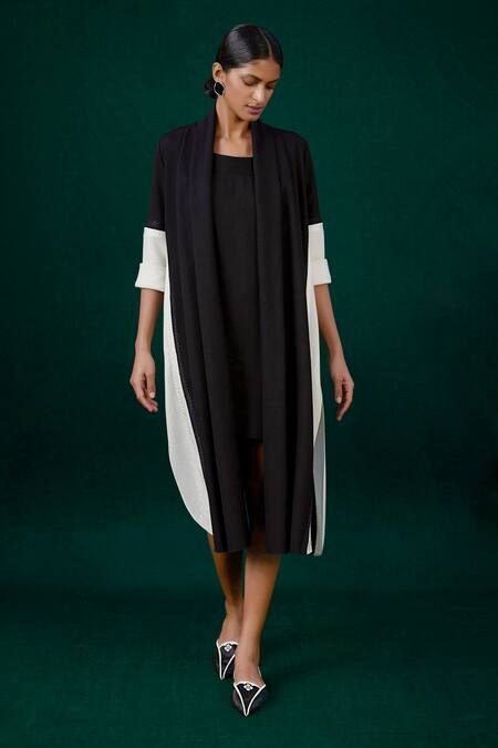 Black wool throw with shawl collar, leaf pattern cord work & contrast white panels.