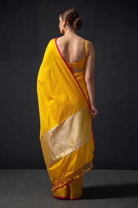 Yellow saree featuring all over geometric tanchoi weaving with contrast pink piping